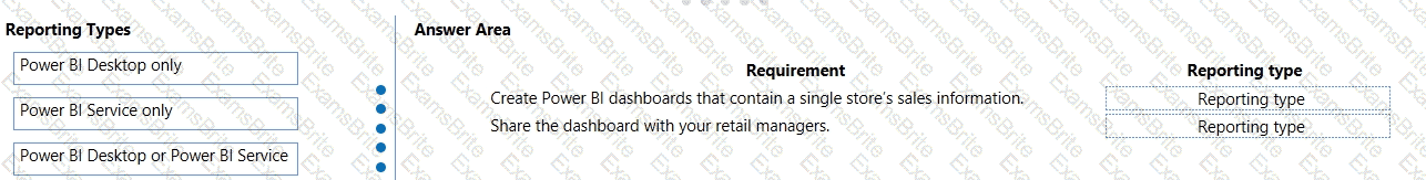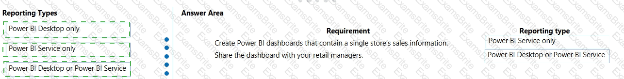 Which tools can you use? To answer, drag the appropriate reporting types to the correct requirements. Each reporting type may be used once, more than once, or not at all. You may need to drag the split bar between panes or scroll to view content.