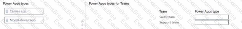 Which type of Power Apps app should you create ' To answer, move the appropriate Power Apps types to the correct teams. You may use each Power Apps type once, more than once, or not at all You may need to move the split bar between panes or scroll to view content