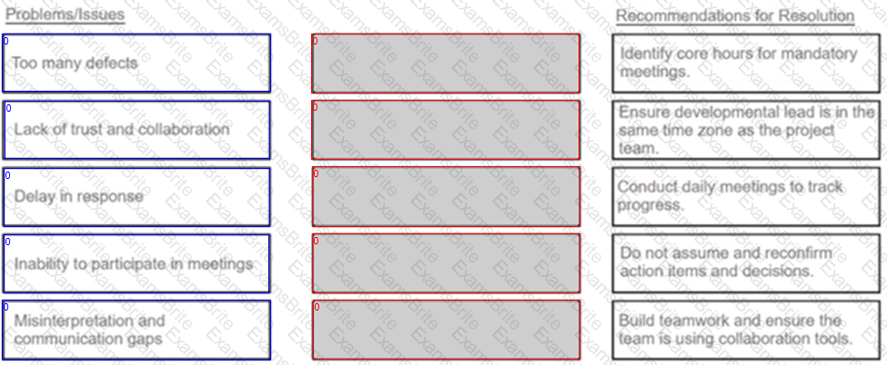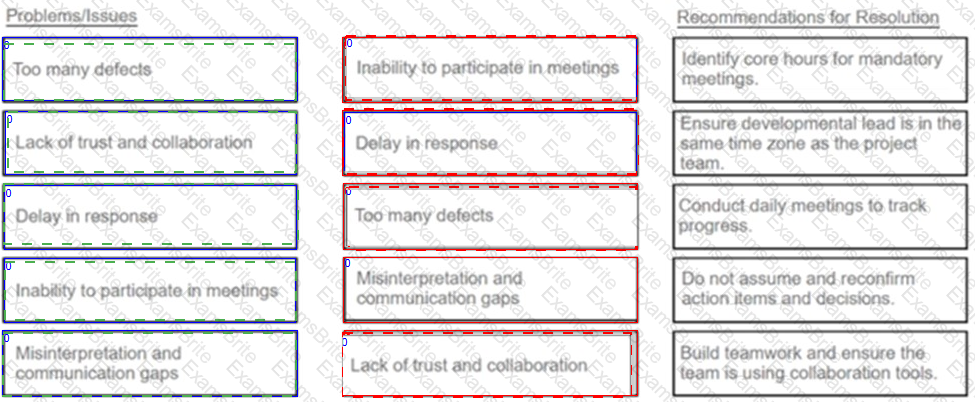 All the developers on a project team are working offshore in a different time zone, resulting in many issues. Match the issues to the agile practitioner's recommendations for resolutions below. (Drag the Problems/Issues on the left to the box in the center, corresponding to the correct Recommendations for Resolution on the right)