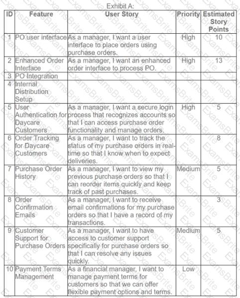 implementing purchase order (PO) functionality. To achieve this, the agile project team is exploring PO integration options (see item #3 in Exhibit A), as the product increment (PI) planning process is underway.
