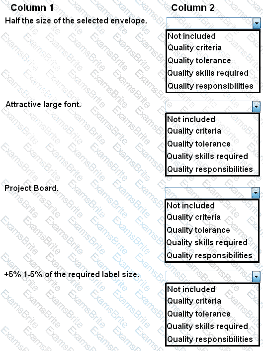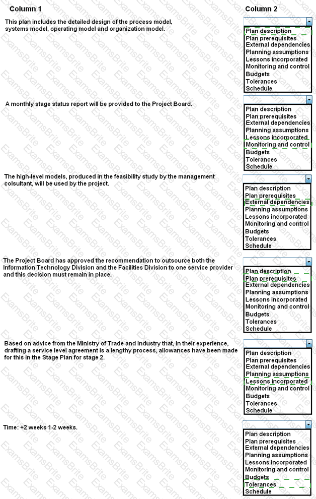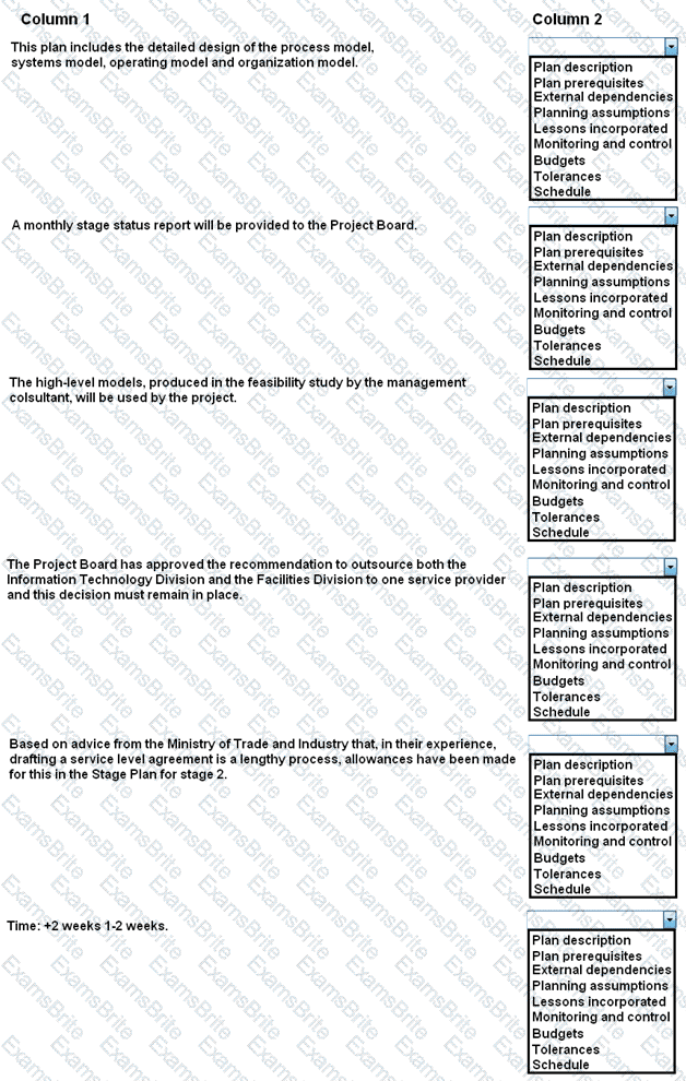Column 1 contains a number of risk responses identified by the Project Manager following an assessment of this risk. Column 2 contains a list of threat response types. For each risk response in Column 1, select from Column 2 the type of response it represents. Each option from Column 2 can be used once, more than once or not at all.