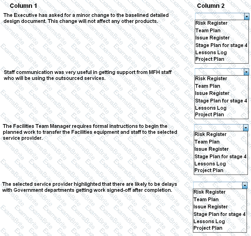 The Outsourcing project has completed the Starting up a Project process and is now in the initiation stage. Because of the strategic importance of the project, the MFH Chief Executive Officer has taken the role of Executive. A PRINCE2-experienced Project Manager has been appointed from within MFH. Staff within the business functions being outsourced will work with the external consultants who conducted the feasibility study to define the detailed designs.