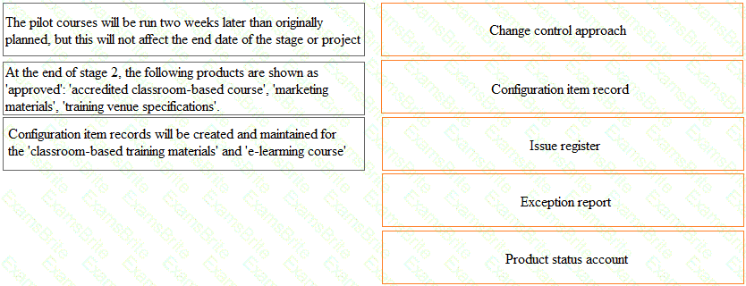 Column 1 is a list of entries from the Daily Log that occurred during stage 4 in the Controlling a Stage process. For each entry in Column 1, select the first management product from Column 2 that should have been updated, or created, as a result of the entry. Each selection from Column 2 can be used once, more than once or not at all.