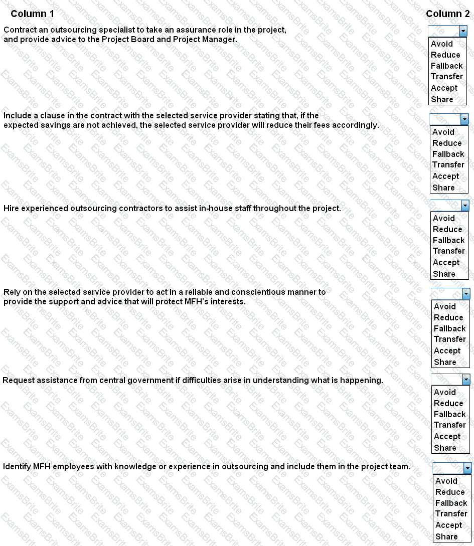 Column 1 contains a number of possible risk responses to the above risk. For each risk response, select from Column 2 the appropriate risk threat response type that it represents. Each selection from Column 2 can be used once, more than once or not at all.
