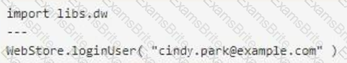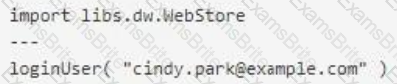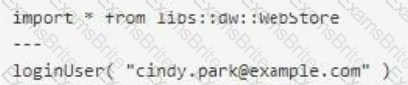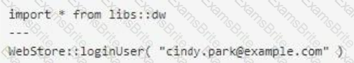 What is correct DataWeave code to import all of the WebStore.dwl file's functions and then call the loginUser function for the login "cindy.park@example.com"?