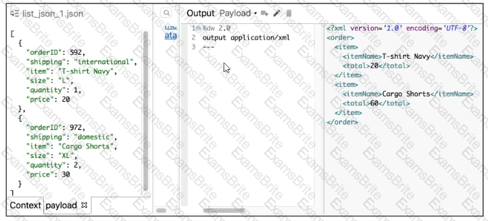 Refer to the exhibits. In the choice router, the When expression for the domestic shipping route is set to "#[payload= "FR"]".