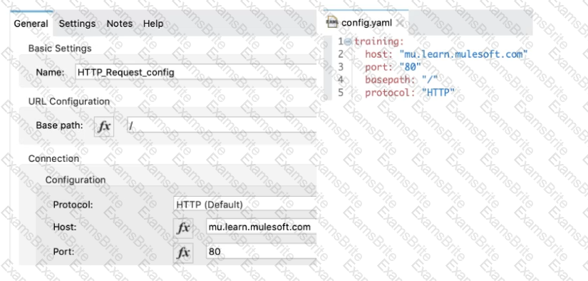 A Mule application has an HTTP Request that is configured with hardcoded values. To change this, the Mule application is configured to use a properties file named config.yaml.