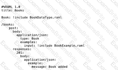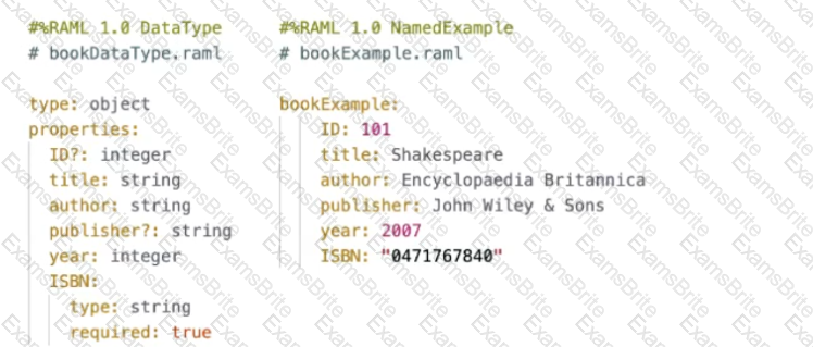 Refer to the exhibits. A company has defined this Book data type and Book example to be used in APIs. What is valid RAML for an API that uses this Book data type and Book example?