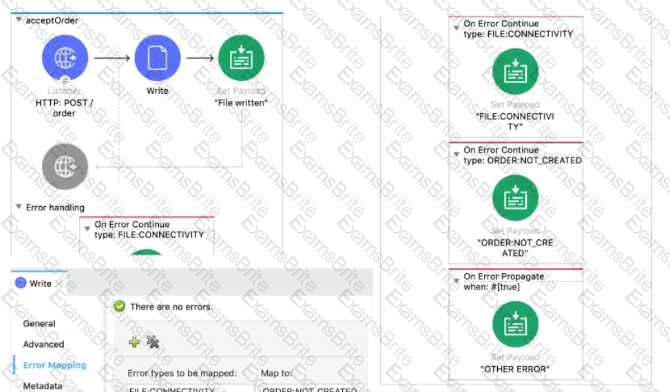 A web client sends a POST request with the payload {"oid": "1000", "itemid": "AC200", "qty": "4" } to the Mule application. The File Write operation throws a FILE:CONNECTIVITY error.