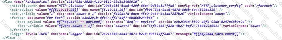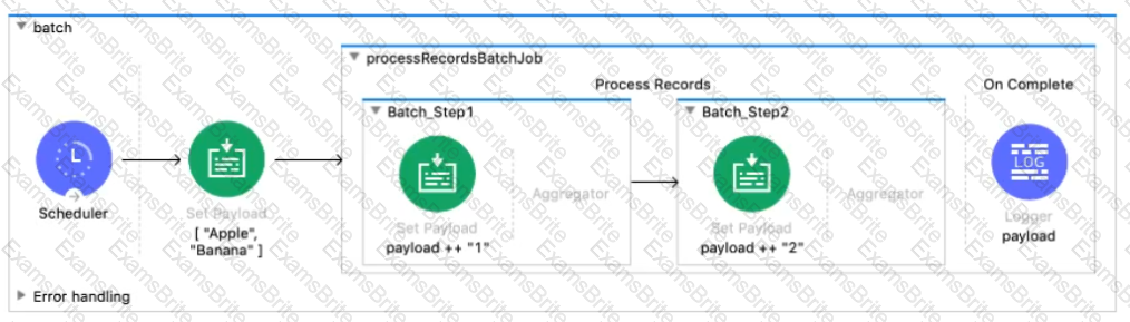 Refer to the exhibit. The input array of strings is passed to the batch job, which does NOT do any filtering or aggregating. What payload is logged by the Logger component?