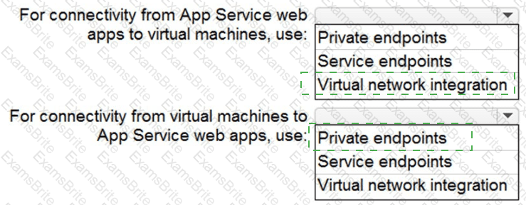 You need to recommend a strategy for App Service web app connectivity. The solution must meet the landing zone requirements. What should you recommend? To answer, select the appropriate options in the answer area. NOTE Each correct selection is worth one point.