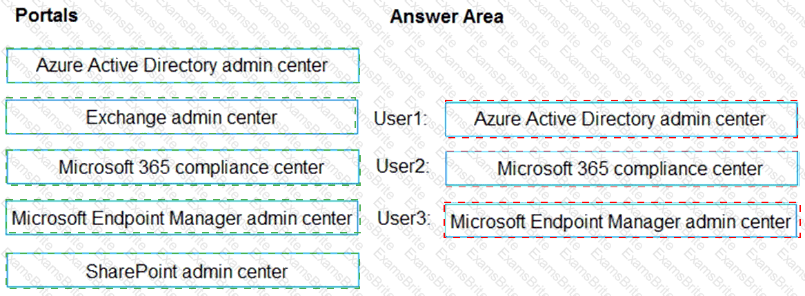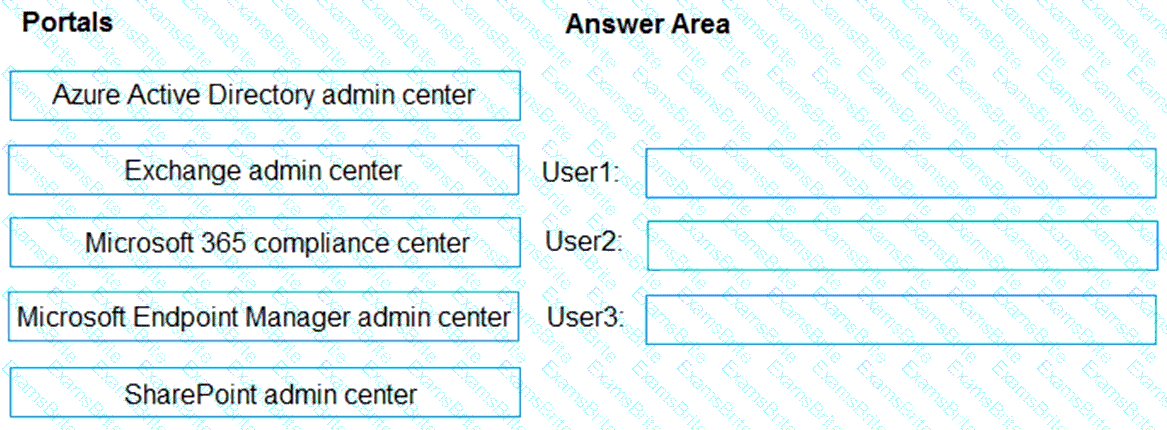 Which portal should you use to configure each user? To answer, drag the appropriate portals to the correct users. Each portal may be used once, more than once, or not at all. You may need to drag the split bar between panes or scroll to view content.