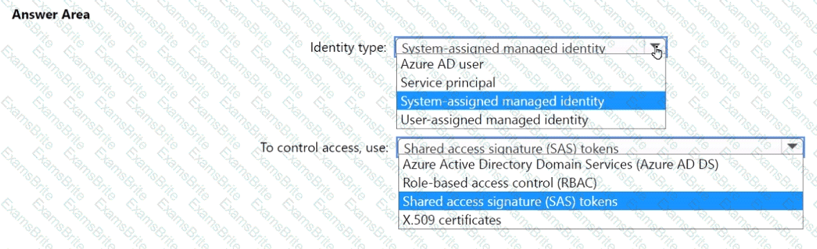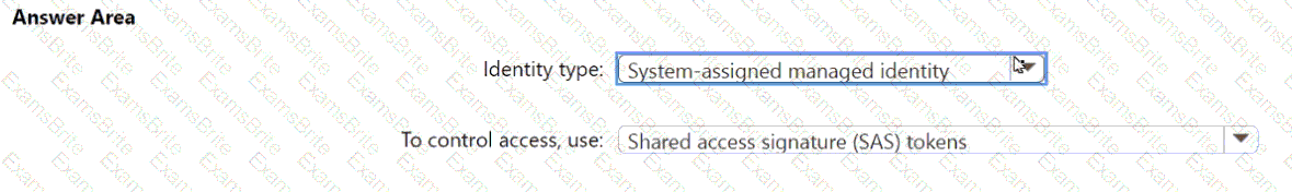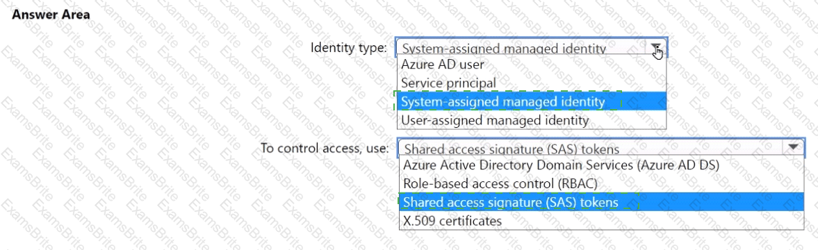 Which type of identity should you recommend, and what should you recommend using to control access to the storage accounts? To answer, select the appropriate options in the answer area.