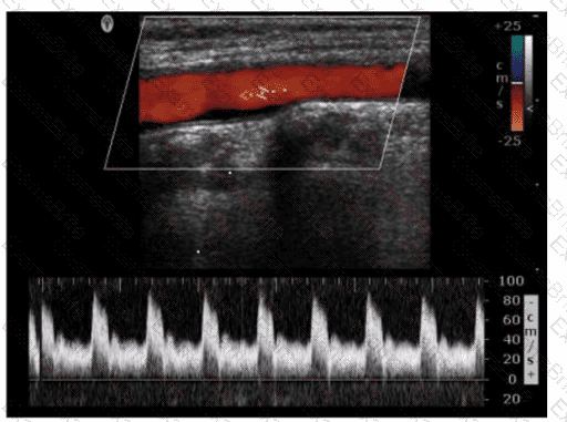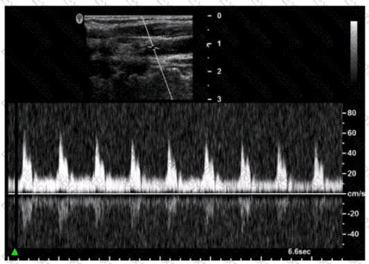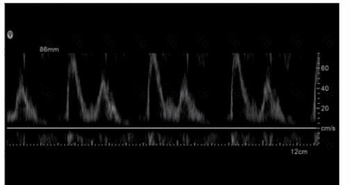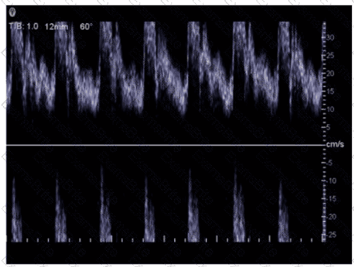 Which adjustment would reduce the noise in the Doppler waveform in this image?