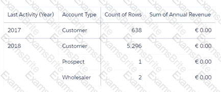 Universal Containers has a Sales Manager dashboard- They have a compare table that displays the count of Customers and the Sum of Annual Revenue per year and per Account type. A consultant is asked to add more groupings to enhance details about their customers.