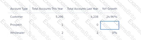 Universal Containers has a dashboard for Sales Managers to visualize the YoY Growth of their customers- The formula used is: YoY = [(This Year - Last Year) / Last Year] %