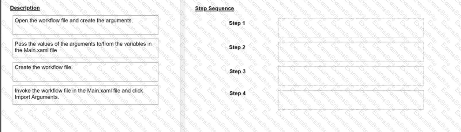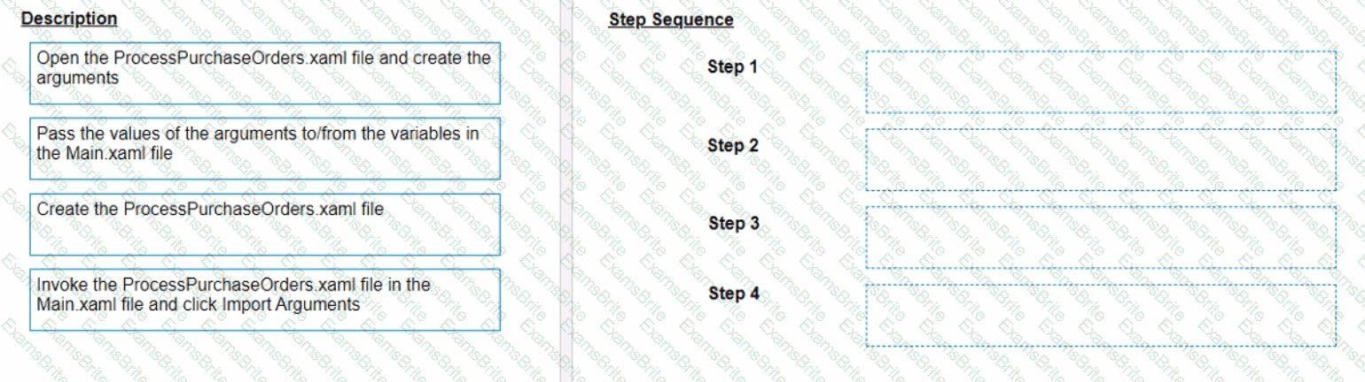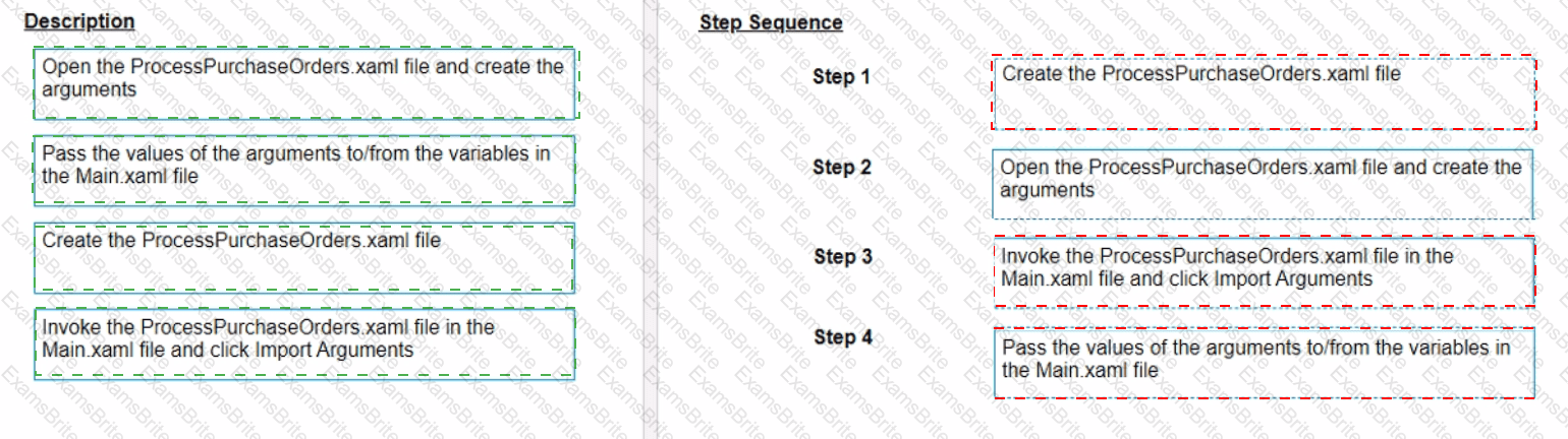 A developer wants to invoke a workflow in Main xaml called ProcessPurchaseOrders.xamI. Data needs to be passed to and from the invoked workflow What is the correct sequence of steps the developer needs to perform?