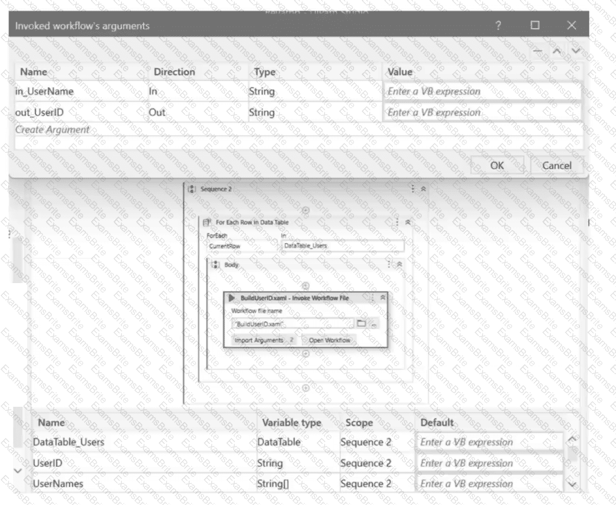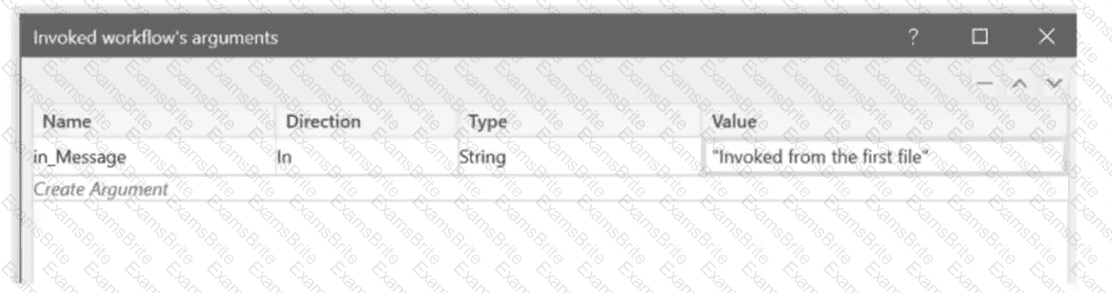You are invoking a workflow file called "SecondaryWorkflow.xaml" from "PrimaryWorkflow.xamr. The following shows the Import Arguments panel of the Invoke Workflow File activity: