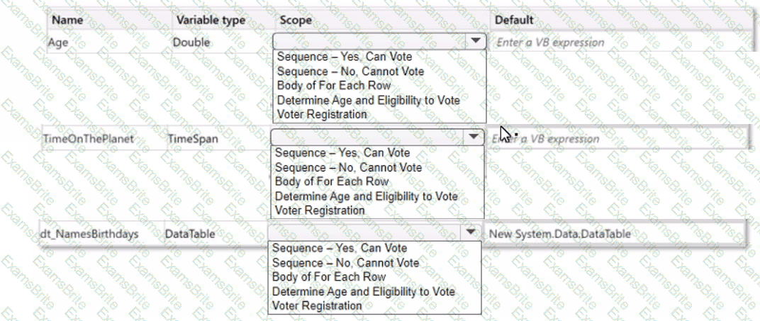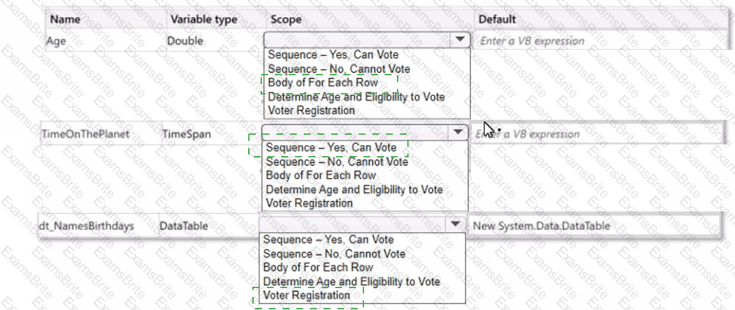 Instructions: Based on best practices, select the correct Scope for each Variable type from the drop-down lists shown in the following exhibit.