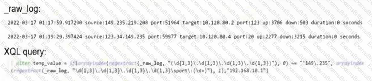 Based on the _raw_log and XQL query information below, what will be the result(s) of the temp_value?